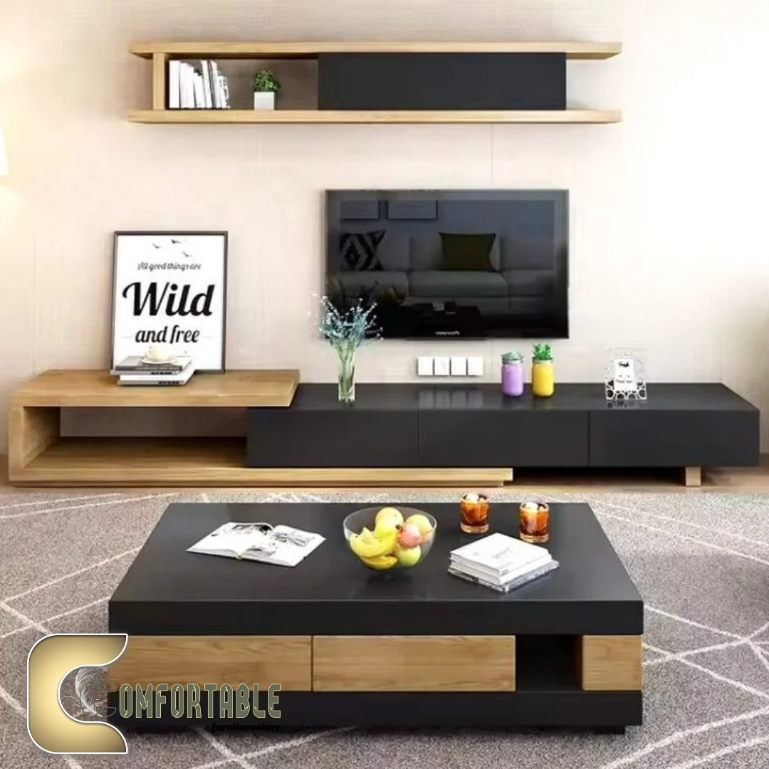 مزودة بمساحات تخزين منظمة ورف جداري للديكور، كما تأتي معها ترابيزة وسط بنفس الطابع لمنح الغرفة شكل متكامل وعصري.