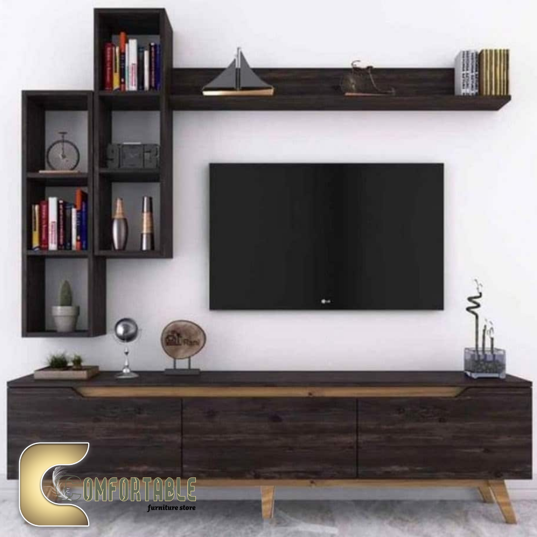 وحدة تلفزيون مودرن من خشب  أم دي  أف أو كونتر مع أدراج ورفوف حائط عملية، تصميم أنيق لغرفة المعيشة يجمع بين الجودة والوظيفة – Modern TV Stand with Shelves.