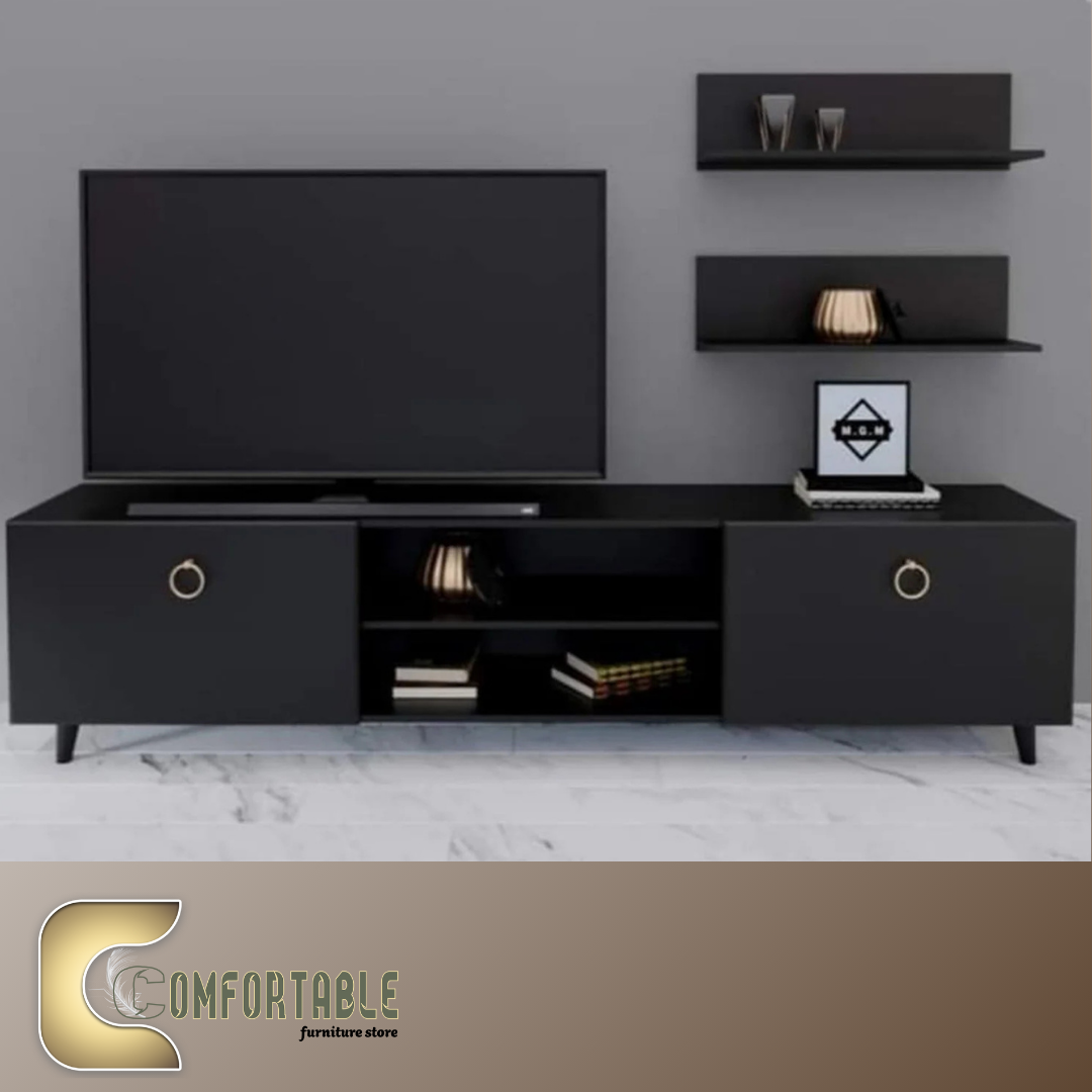 وحدة تلفزيون مودرن من خشب  أم دي  أف أو كونتر مع أدراج ورفوف حائط عملية، تصميم أنيق لغرفة المعيشة يجمع بين الجودة والوظيفة – Modern TV Stand with Shelves.