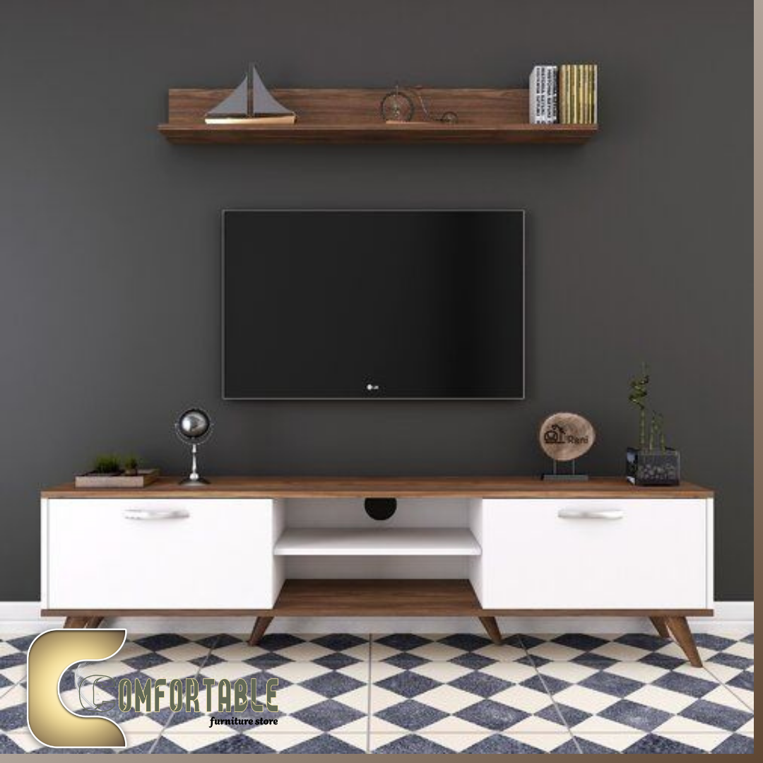 وحدة تلفزيون مودرن من خشب  أم دي  أف أو كونتر مع أدراج ورفوف حائط عملية، تصميم أنيق لغرفة المعيشة يجمع بين الجودة والوظيفة – Modern TV Stand with Shelves.